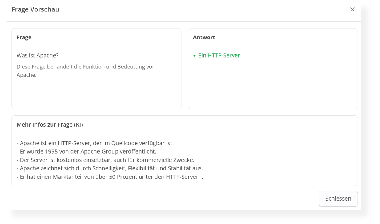 Zusätzlich zur Kartengenerierung können Nutzer gezielt Fragen zu einzelnen Lernkarten an die KI stellen. Die Antworten werden nicht nur angezeigt, sondern strukturiert in der Datenbank gespeichert und stehen damit dauerhaft zur Verfügung.