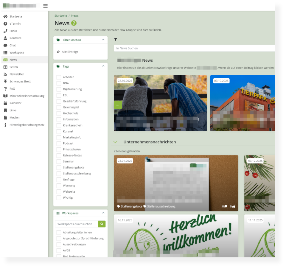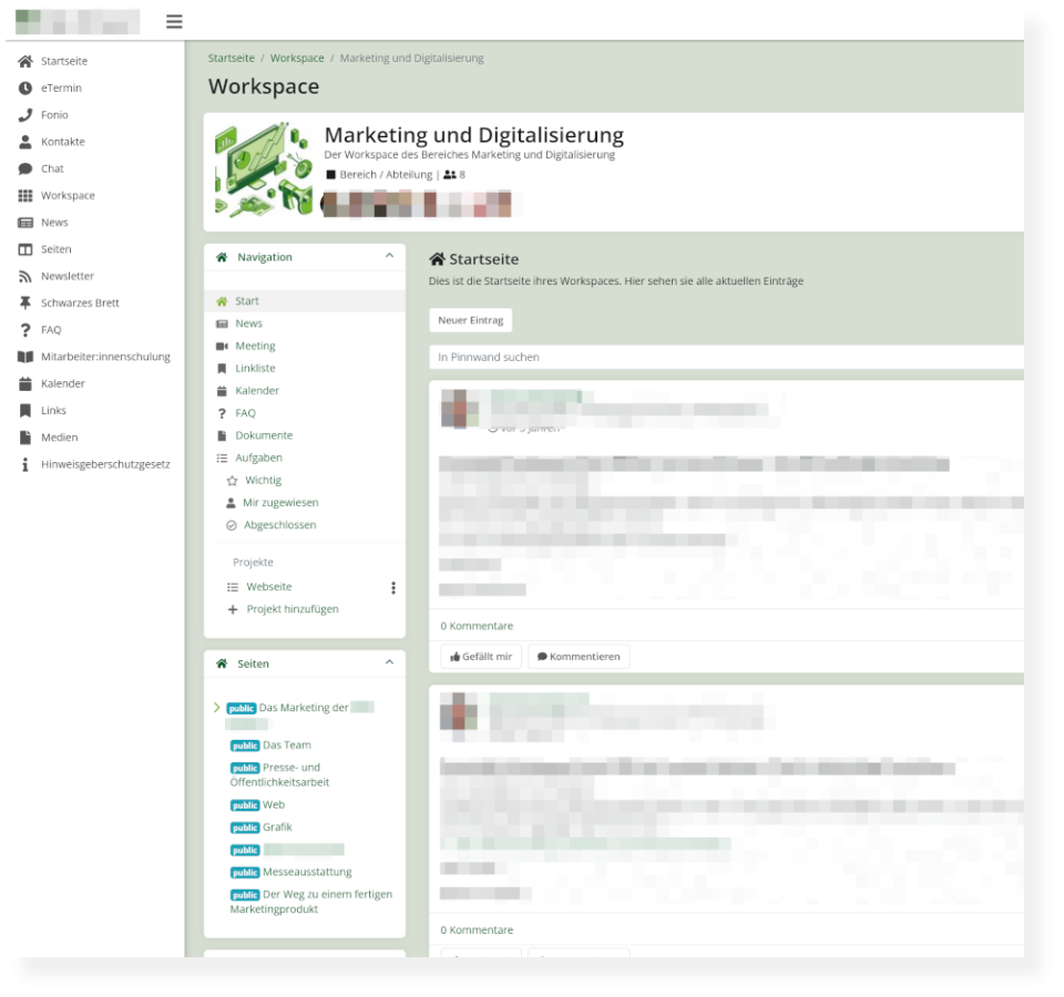 Workspaces sind thematische Arbeitsräume – vergleichbar mit Gruppen – die Mitarbeitende fachlich verbinden (z. B. Marketing, IT/EDV, Verwaltung). Innerhalb eines Workspaces können Teams Inhalte erstellen und gemeinsam nutzen: